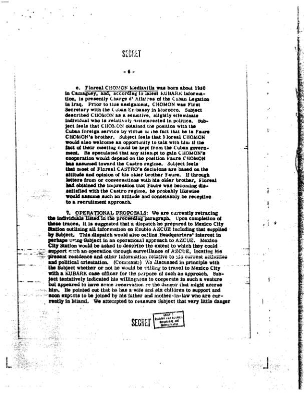 c. Floreal CHOMON Medina Villa was born about 1930 in Camaguey, and, according to latest KUBARK information, is presently in charge of Affairs of the Cuban Legation in Iraq. Prior to this assignment, CHOMON was First Secretary with the Cuban Embassy in Morocco. Subject described CHOMON as a sensitive, allegedly effeminate individual who is relatively uninterested in politics. Subject feels that CHOMON obtained the position with the Cuban foreign service by virtue of the fact that he is Faure CHOMON's brother. Subject feels that Floreal CHOMON would also welcome an opportunity to talk with him if the fact of their meeting could be kept from the Cuban government. He speculated that any attempt to gain CHOMON's cooperation would depend on the position Faure CHOMON has assumed toward the Castro regime. Subject feels that most of Floreal CASTRO's decisions are based on the attitude and opinion of his older brother Faure. If through letters from or conversations with his older brother, Floreal had obtained the impression that Faure was becoming dissatisfied with the Castro regime, he probably likewise would assume such an attitude and conceivably be receptive to a recruitment approach.