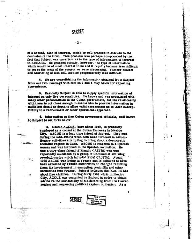 1. Eusebio AZCUE, born about 1912, is presently employed as a consul at the Cuban Embassy in Mexico City. AZCUE is a long time friend of Subject. They met during the mid-1950's when both were involved in revolutionary activities attempting to bring about a democratic socialist regime in Cuba. AZCUE is married to a Spanish woman and was involved in the Spanish revolution. He was a very close friend of Manolo CASTRO who was reportedly murdered by a group of Communist left wing revolutionaries which included Fidel CASTRO. About 1963 AZCUE was living in France and is believed to have been arrested by French authorities in the case resulting from his involvement in smuggling penicillin and other antibiotics into France. Subject believes that AZCUE has about five children. During early 1964 while in Mexico City, AZCUE was contacted by Subject in order to obtain advice on the advisability of his defecting from the Castro regime and requesting political asylum in Mexico. As a