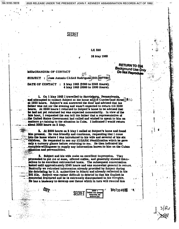 3. Subject and his wife made an excellent impression. They proceeded to put me at ease, offered coffee, and generally showed themselves to be excellent extroverted hosts. The subsequent conversation which lasted until approximately 2345 hours was also generally general in nature, basically revalidated information already provided by Subject during his debriefing by U.S. authorities in Miami and already reflected in his file. Subject was rather difficult to debrief in that his English is somewhat fractured and he is extremely disorganized in his thoughts. He has a tendency to develop one theme which in turn will remind him...